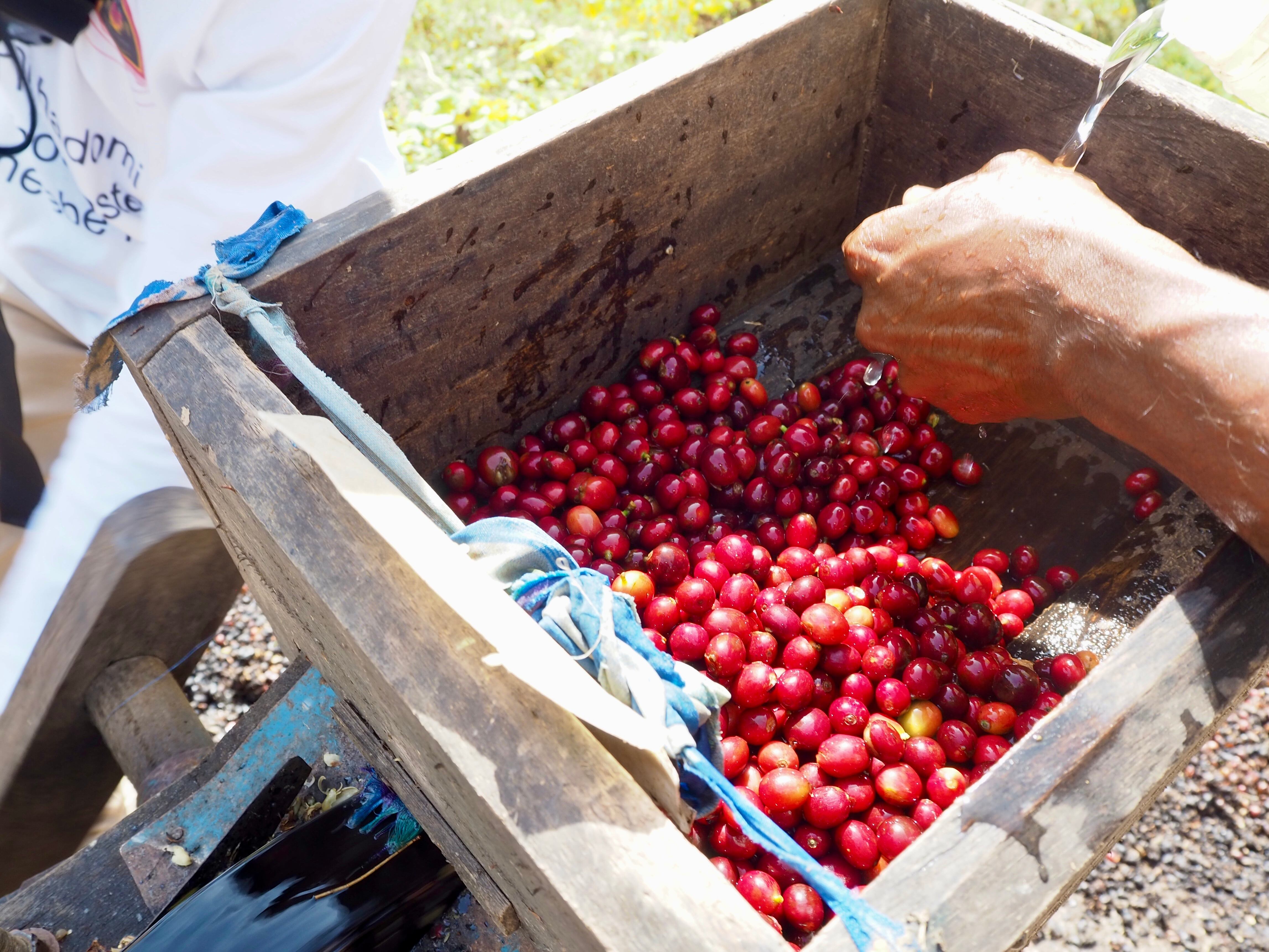 あまり水が豊富な地域ではなく、山水をタンクに汲み精製を行っています。 赤いチェリーが沢山あり、糖度確認をすると21.5%とハイスコア!将来的にはハニーやナチュラルを試しても良いかもしれないねと話をしている村でもあります。 レヌマタ村で見たパルパーが、こちらの村でもしっかり稼働をしていました。